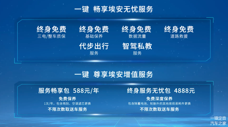 “三电”不仅是纯电动车的动力核心,更是根基所在,也是消费者购车时最为关注的问题之一。为此,AION LX Plus推出了行业最高标准的服务,包括“三电”和“整车”终身免费质保、终身免费基础保养,用车放心,免除了一切后顾之忧。此外AION LX Plus还提供终身免费数据流量、免费道路救援等优越服务,让车主惬意畅享绿色出行体验。另外AION LX Plus还为车主提供行业独创的上门智驾私教服务,足不出户便可享受一对一上门教学,轻松拥有智能驾驶辅助系统带来的便利出行。