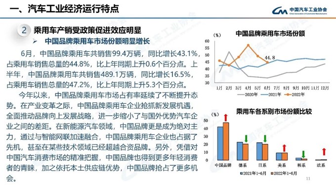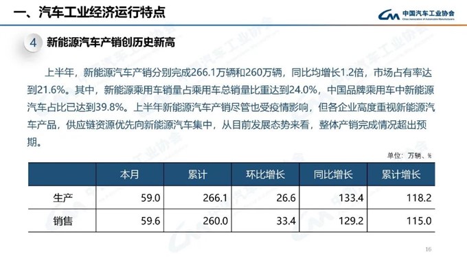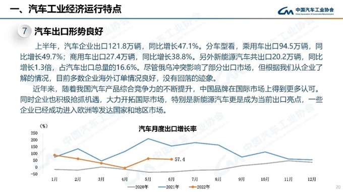 6月以来,我国汽车产业受疫情影响的供应链已全面恢复,企业加快生产节奏弥补损失。在国家购置税减半政策、地方政府促汽车消费政策叠加下,我国汽车市场表现良好。新能源汽车产销创历史新高,分别完成59万辆和59.6万辆,同比均增长1.3倍。其中纯电动汽车产销量同比均增长1.2倍。与此同时,上半年,汽车企业出口121.8万辆,同比增长47.1%。中国品牌在国际市场上得到更多认可,特别是新能源汽车更是成为当前出口亮点。