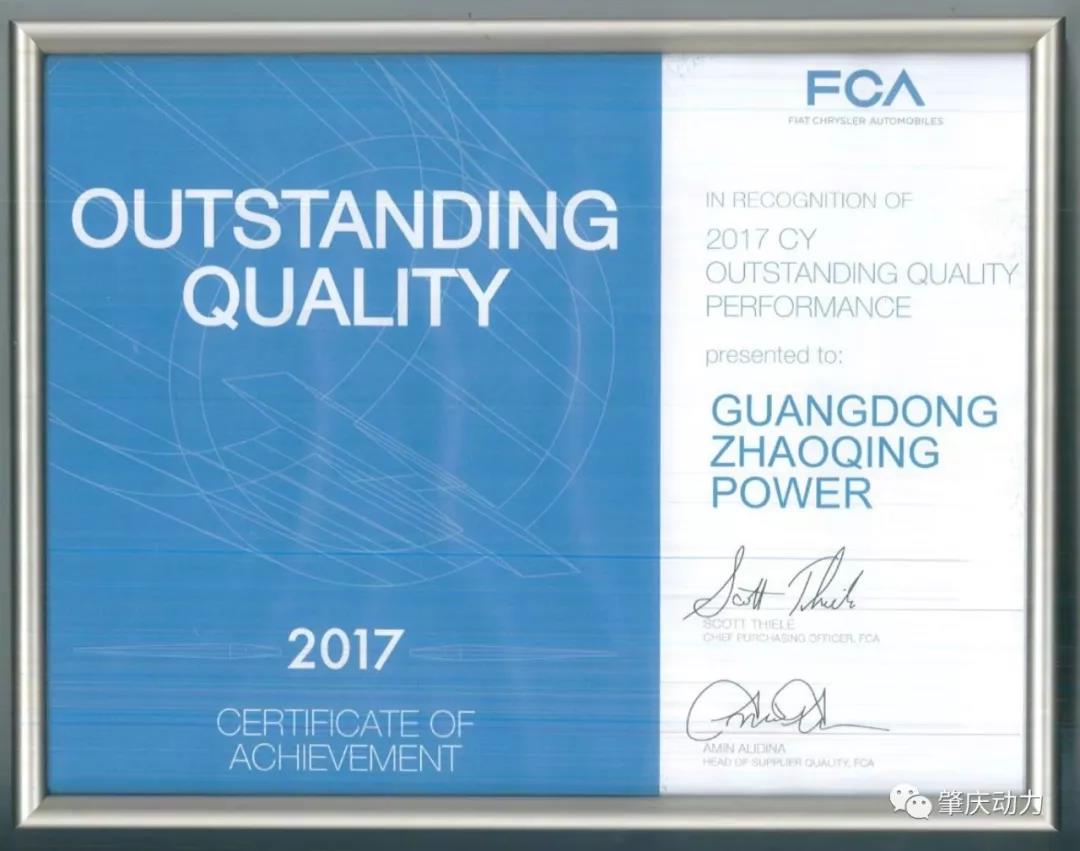 肇庆动力荣获“菲亚特-克莱斯勒汽车集团杰出质量表现奖”
