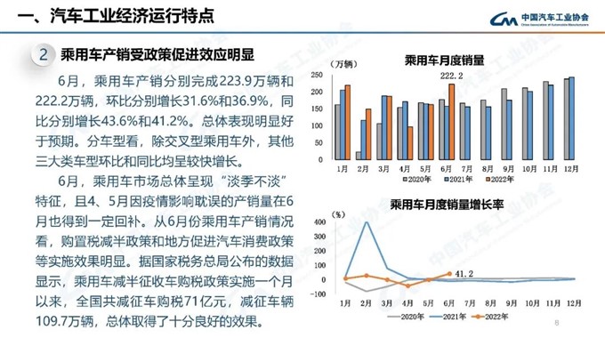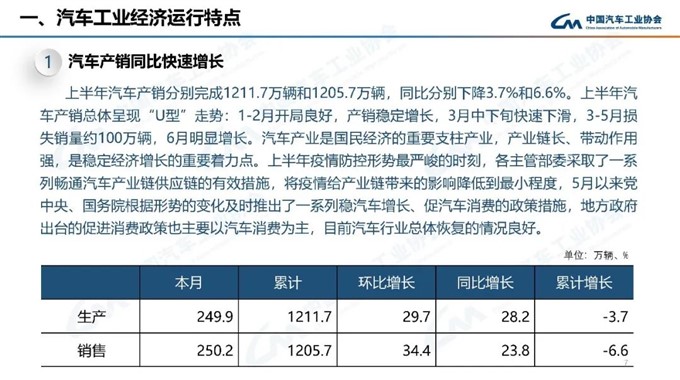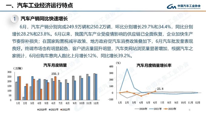 7月11日,中国汽车工业协会公布的数据显示,汽车行业已经走出4月份的最低谷,6月产销表现更是好于历史同期。最新数据显示,6月份,我国汽车产销分别完成249.9万辆和250.2万辆,同比分别增长28.2%和23.8%。其中乘用车产销223.9万辆和222.2万辆,同比分别增长43.6%和41.2%。